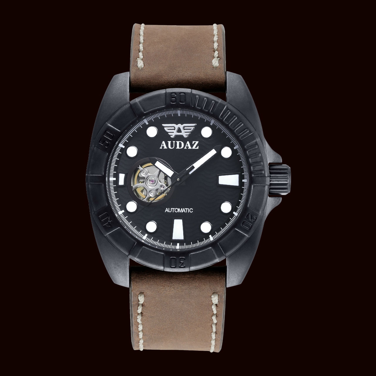 A unique and charming timepiece that is well built with a solid design, sleek silhouette, as well as reliable performance. Housed in the 44mm black case is a matching round dial, which allows easy readability even at night with the clear hands and indexes filled with lume. The brown leather strap offsets the dark tone pleasantly and gives an impressive touch to the wrist.