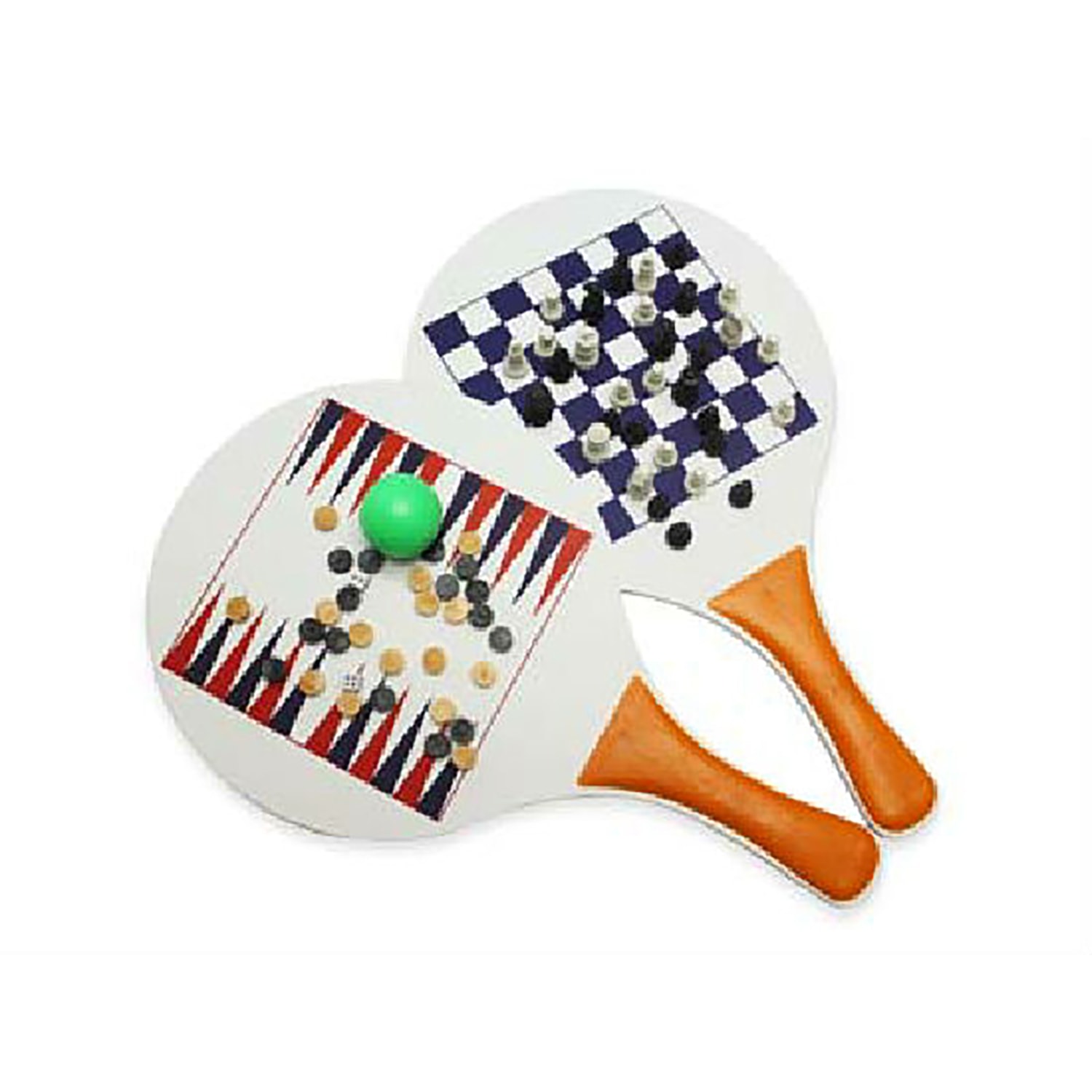 Chessboard pattern and backgammon board pattern are printed on each racket respectively