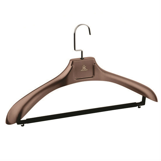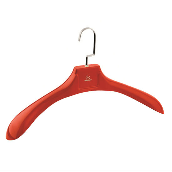 Hold your suits and coats nicely with the pictured garment hanger. This sleek plastic hanger is simple and appealing with a printed brand name logo. It will go well with different wardrobes or racks.