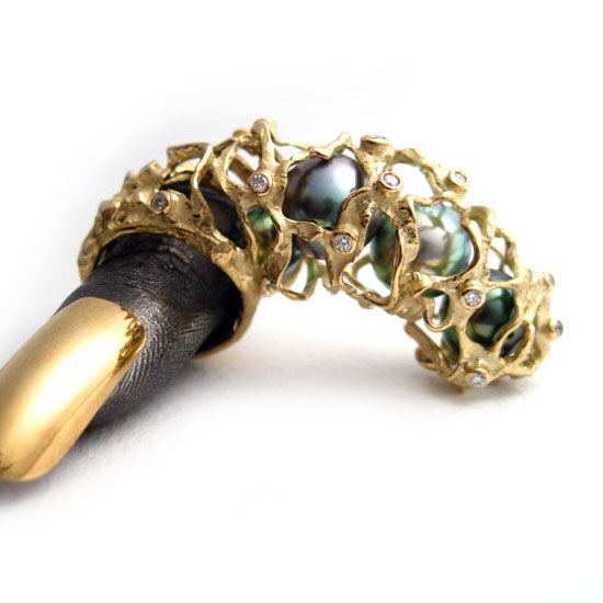 This finger ring stands out from the rest with an extended basket design. Inside the 18k yellow gold basket, there are polished South Sea pearls in alluring black. The band and basket are also refined with diamond details.
