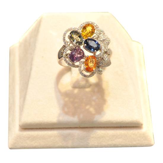 This is a 18k white gold ring set with fancy sapphires and small diamonds. Five faceted oval sapphires, which are in yellow, blue, green, purple and orange, are prong-set on the top in an non-structured pattern, which is accentuated with small diamonds surrounding them.