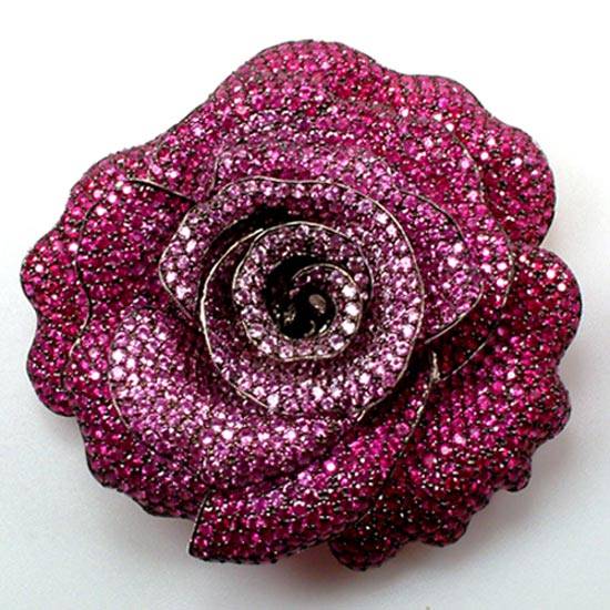 A gemstone brooch is designed in a rose shape.