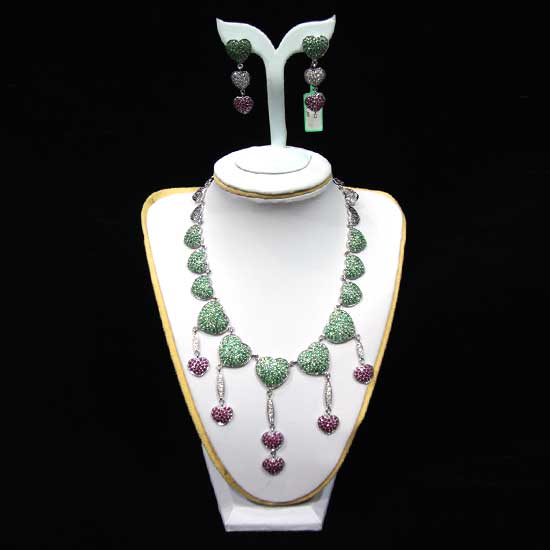 This necklace and earrings cater for ladies with adorable heart-shaped pendants. The ruby and green semi-precious stones make an eye-catching contrast. Put on these sparkling jewelry items to show off your glamor.
