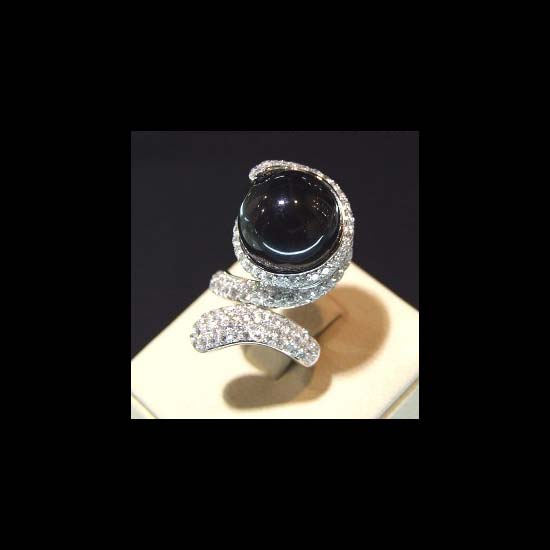Pave setting of silver white gemstones surround the cabochon cut stone