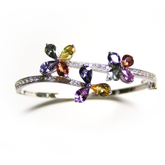 - Translucent drop cut multi-colored gemstones form flower shapes.
