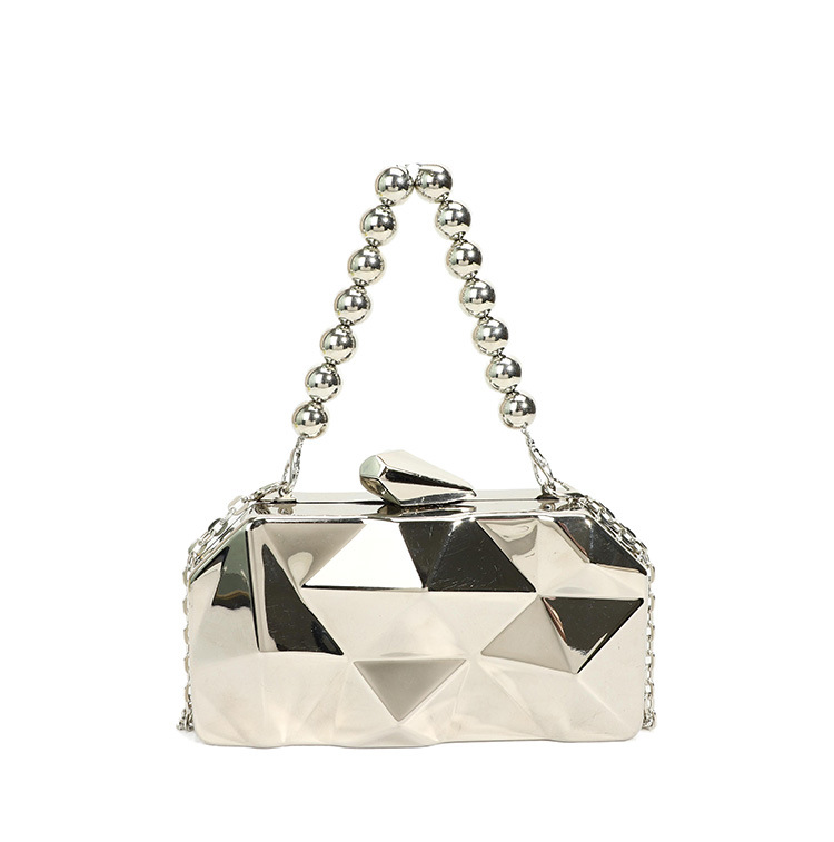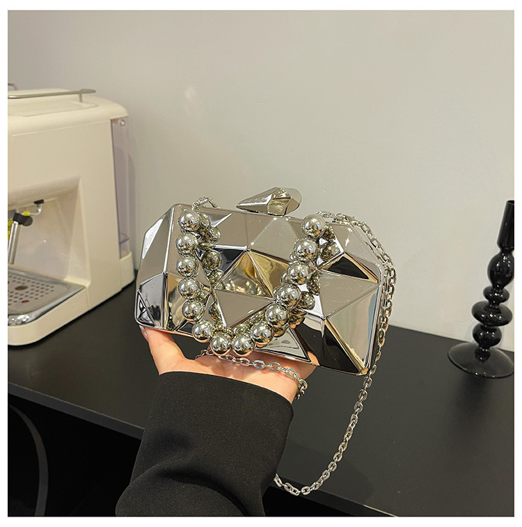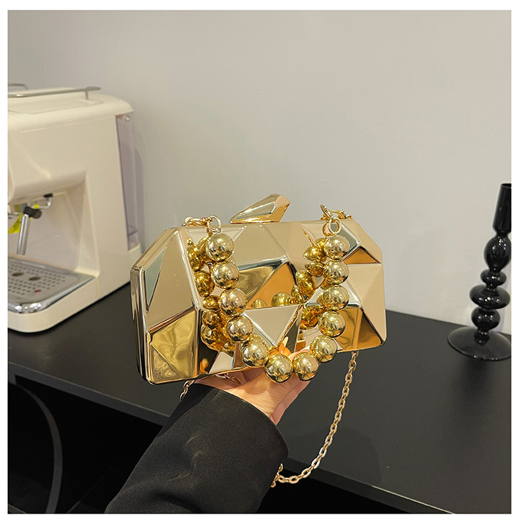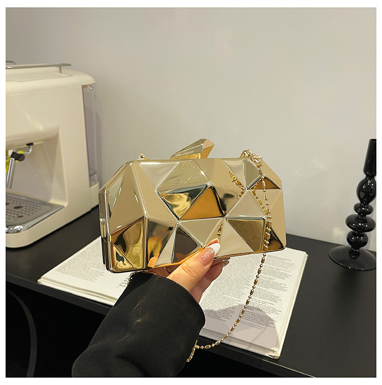 Features glossy geometric design with metallic finish and adjustable chain strap for versatile carry.
