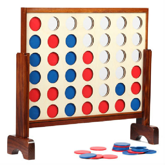 The game can be quickly assembled in seconds and can be played indoors or outdoors. 4-In-a-row is played by players taking turns inserting coins into the 7 slots on the top. A game is won when any one player gets 4 of their color coins in a row (vertically, horizontally or diagonally), so each player must always keep an eye on their opponent's moves to try and block their 4 in a row.