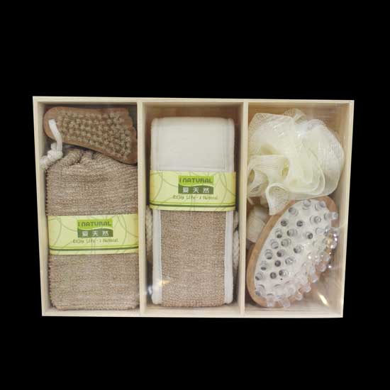 This gift bath set includes a bath towel, a foot brush, a back strap, a massager brush and a loofah. The bath set is great for exfoliating skin and cleaning our body. The bath gift set is finely packaged in a window gift box.