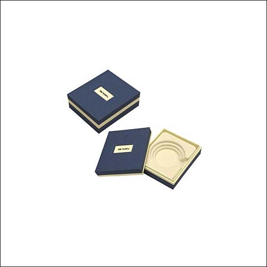 The displayed gift box comes in a rectangular shape and has a molded tray inside. It is covered with a lid and provides safe and organized storage. This gift box offers ample storage space and can add a classy touch to the packaged product.