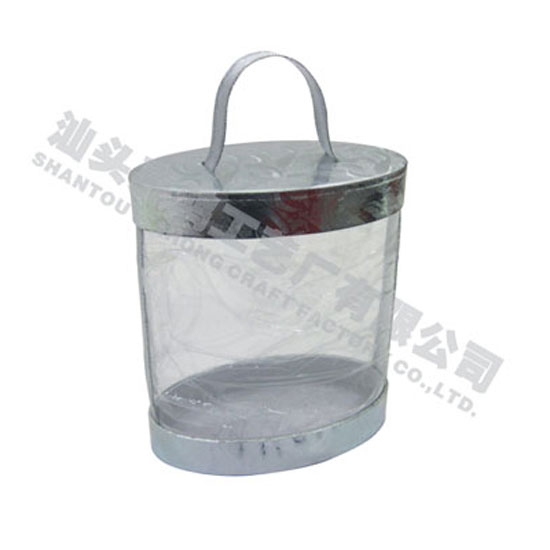 This oval-shaped gift box features a transparent body with a silver-toned lid and bottom. The gift box is designed with a top handle for easy carrying. It is an ideal packaging material for a variety of products.