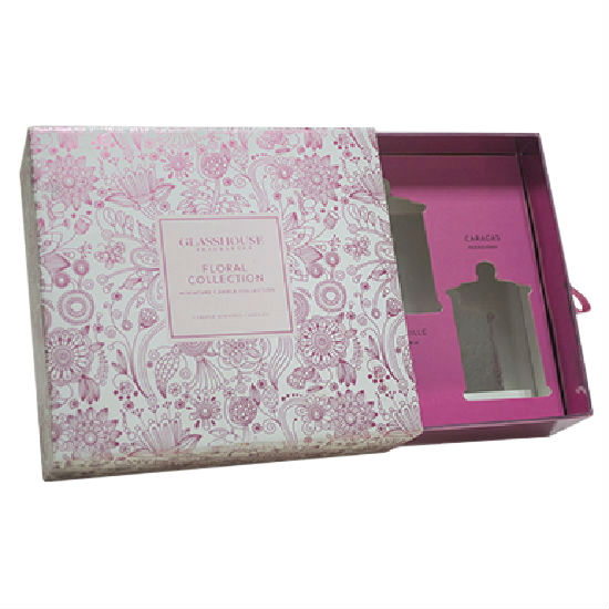 This rectangular box is embellished with floral patterns on the exterior. It has a pull-out drawer for storage with a tray inside the drawer. It flaunts a beautiful and elegant design and is ideal for cosmetic packaging.
