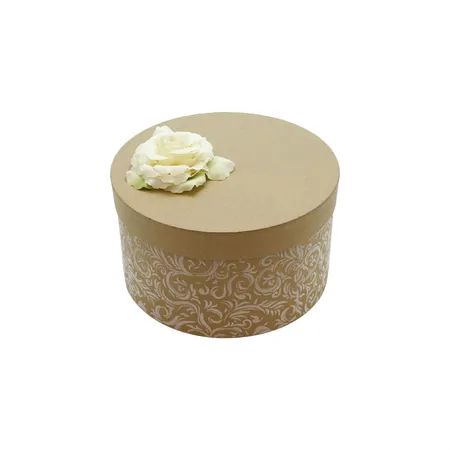Encapsulating gifts with a distinctive earthy elegance, this paper box tours a round profile and prompts a removable lid for easy access. The pink flocking prints on the body further complements its top floral embellishment to channel sophistication.