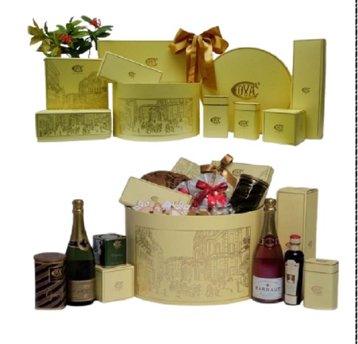 This set of gift boxes is in a soft beige color, adorned with architectural patterns. They are filled with fine wines and delicious foods, seemingly containing a whole box of luxury and sentiment, fully embodying the French romantic style.