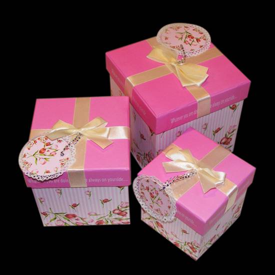 The gift box is made of paper. The cover of the box with ribbon tied up. It is in pink colour.