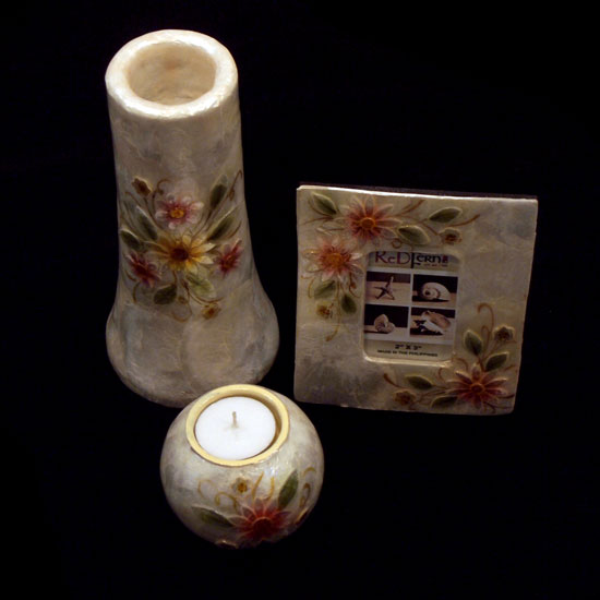 The items of this handicrafts set are made out of Capiz shell. They include a photo frame, a vase and a candleholder. The items are crafted with comely floral patterns.