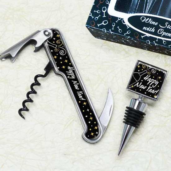 Featured here is a gift set of corkscrew and a wine stopper. It is designed with charming festive graphics for new year celebrations. Gift sets with customized packaging and designs are also available.
