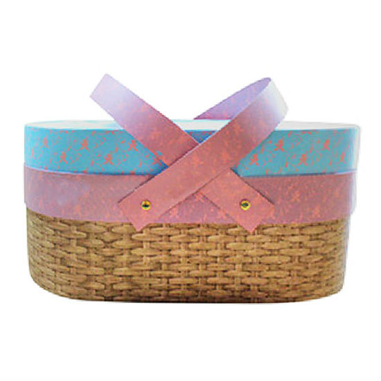 This gift packaging case is beautifully designed and printed to resemble a picnic basket. It boasts a colorful and patterned exterior to complement any gift choice. This paper gift packaging case wraps any gift beautifully for a lovely presentation.