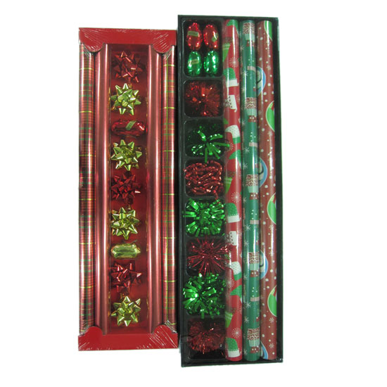 These gift wrapping paper set also includes ribbons, rosettes and other adornments for your packaging needs. The papers are printed in Christmas themes with main colors of red and green. They are great to dress up your well-selected gifts on the special days.