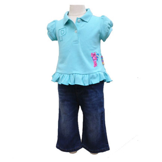 This girls’ wear set includes a turquoise colored polo shirt and a pair of jeans. Made of stretchable cotton pique, this polo shirt comes with lovely puff sleeves and a ruffle hemline with a colorful Elly's embroidery too. The denim jeans feature a boot-cut design with the classic washed effect for added value.