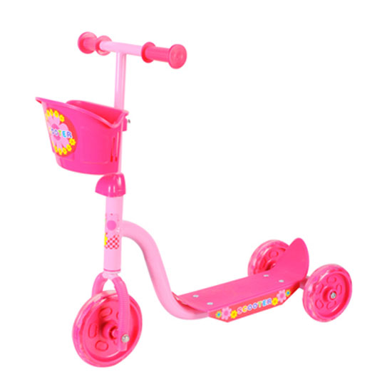 The kids' scooter grabs attention with its vibrant pinkish layout. It is sturdily constructed to ensure durability and safety during play. This piece is also trimmed with cute patterns.