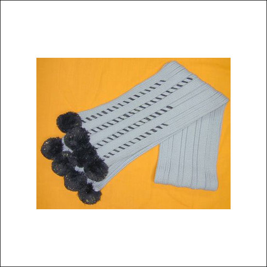 In light blue and decorated with thin stripes and black knitted balls at the end of the scarf