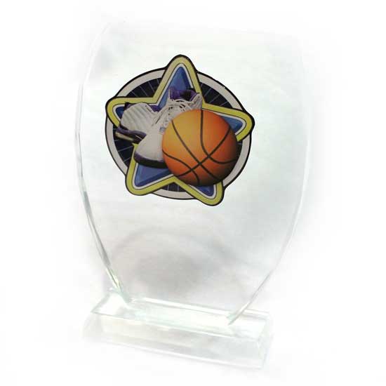 This crystal clear trophy features a simple, streamlined shied-shape with a small rectangular stand. Decorated with a smart basketball print on the transparent surface, this trophy appeals to youngsters. Crafted with glass, this subtle trophy is ideal for school sports events.