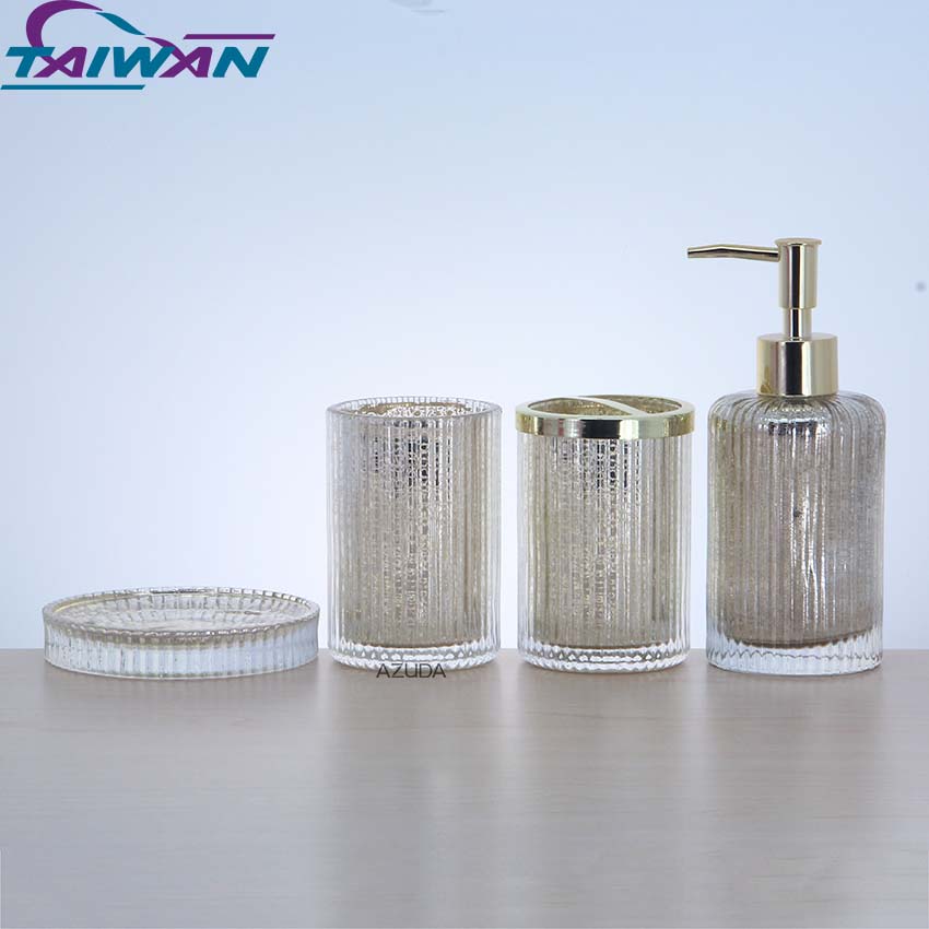 GLASS BATHROOM ACCESSORIES SET RIBBED DESIGN W/MERCURY EFFECT IN GOLD