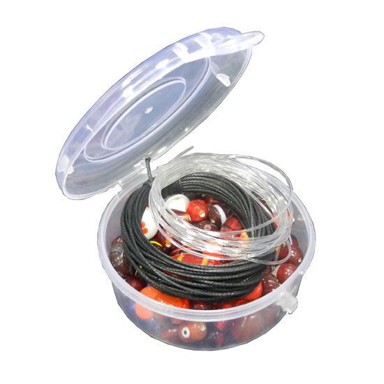 Featured here is a round box set of fancy glass beads with cords. You can create your own bead jewelry conveniently with this kit. This glass bead kit attracts adults and kids.