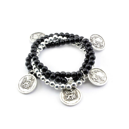 This is a glass bracelet that comes in a fashionable design. Featuring black and silver beads, this bracelet is decorated with round charms in a cameo style. This high quality glass bracelet is great for daily wear.