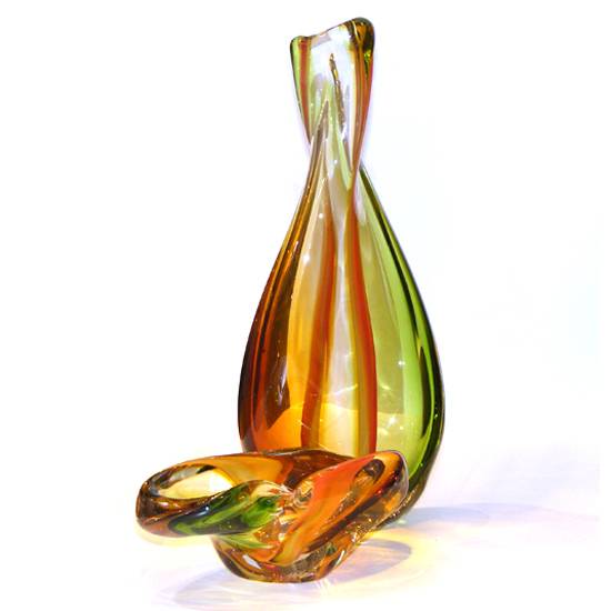 These are a selection of glass decoration. The glass decoration are finely made by glass blowing technique. These glass decoration feature a sculptural quality. The body of these glass ornaments embodies a colour harmony between fiery amber and lime green tones. The glass decorations are an ideal ornament.