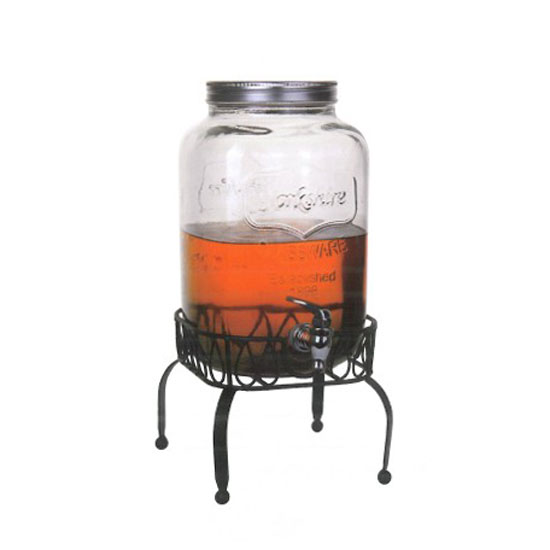 This glass dispenser is a giant version of a jar. The dispenser lets you serve beverages in an elegant and convenient way. This glass dispenser is a nice decoration for a dining table or buffet table.