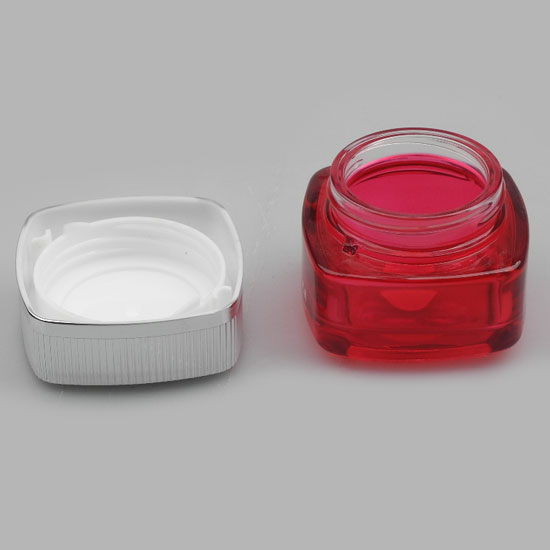We provide glass bottles and jars for cosmetics. Displayed is a tiny jar that is suitable for holding eye care products. The jar is carefully made to ensure excellent durability.
