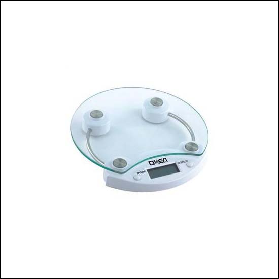 The scale is a circular round shape with a glass surface to put the items on for weighing.