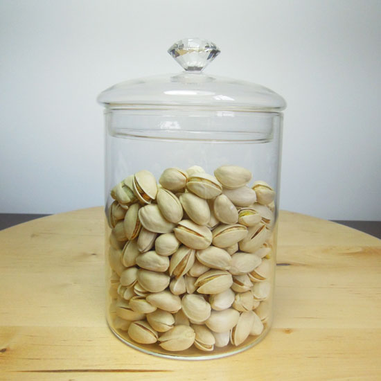 This is a glass storage jar featuring a clear body. It features a tube-shaped body and a matching cap with a dainty knob. This storage jar is ideal for storing assorted foods.