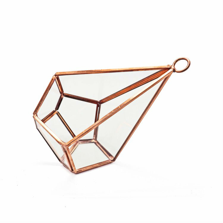 Freshen your home or office decor with this glass terrarium. It has a brass frame with clear glass panel and comes in an upside-down diamond shape. This glass terrarium is an excellent choice for growing small plants and has a ring on top for hanging.