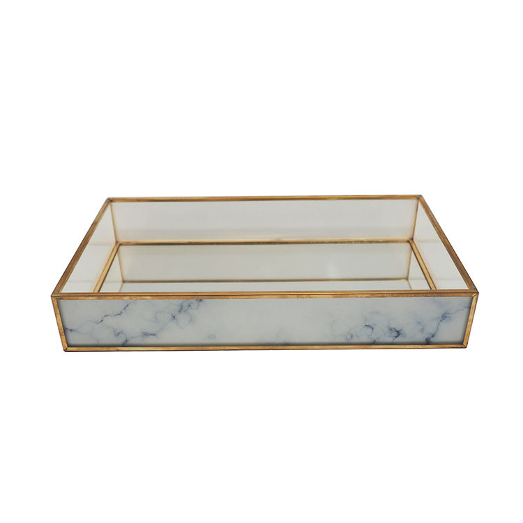 This tray has a brass frame with glass panels and has raised edges and a mirrored bottom. It is decorated with marble patterns in the front and provides lots of space for storage. The tray is excellent for storing and displaying jewelry and is great for home decor use.