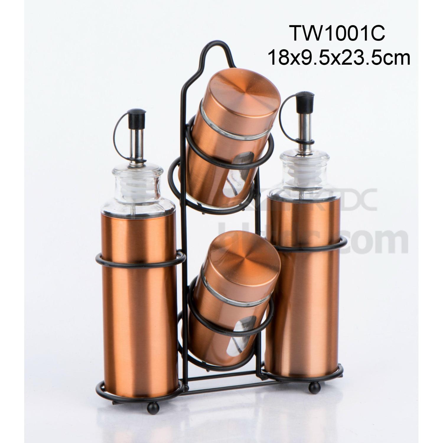 Description: Glass oil vinegar bottle salt pepper jar set with stainless steel casing and iron rack