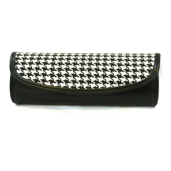 Pictured is a glasses case with a flap closure. The houndstooth check patterns add a trendy touch. The rugged construction promises lasting durability.