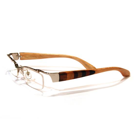 This is a glasses frame with a titinium front. The titanium front gives the glasses a strong and light nature. The hinges of the glasses are made of charry wood and mix with different kinds of wood so to give it different patterns. The glasses frame looks very elegant and classy. It is suitable for both men and women.