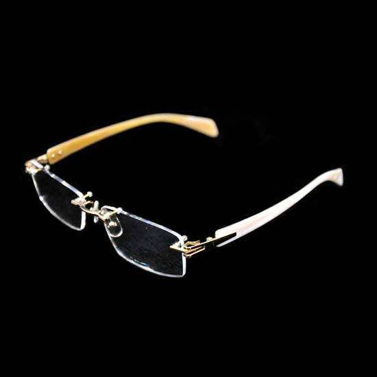 This tasteful rimless men's glasses frame is suitable for rectangular-shaped lenses. The hinges and nose bridge are made of 18K gold in a polished finish. The slim white temples are made of Buffalo horn.