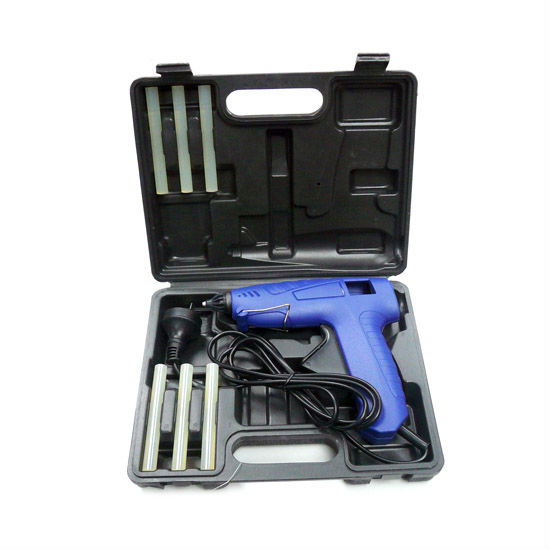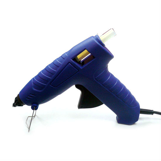 This glue gun has a blue housing with a black tip and trigger and comes with 6 transparent glue sticks. It has a nozzle with drop-stop and has a wire stand near the nozzle. The glue gun is excellent for all kind of DIY tasks and is packaged in a colored box.