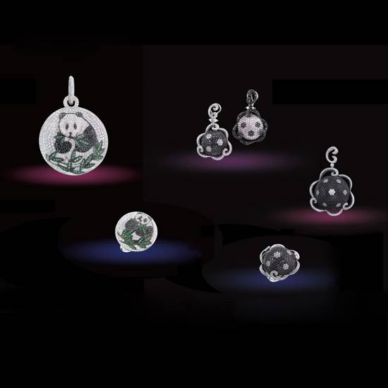 This picture illustrates earrings, pendants and rings that are made of 14K and 18K gold and natural gemstones. Each piece have micro-setting stone to add beautiful color and patterns such as pander and football. The gold parts are in silver color.