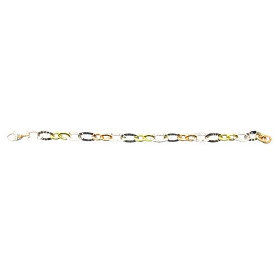 This is a piece of gold chain for making jewellery such as bracelet. It has loops in copper, silver and gold in different sizes connected together. Charms and ornaments can be hung on the chain to produce charm bracelets in various styles.