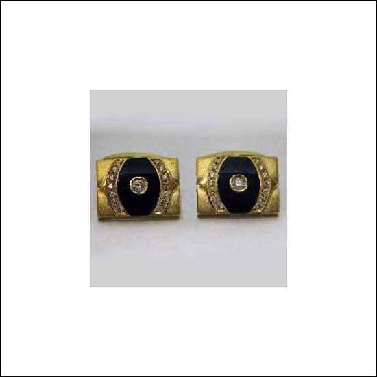A white stone in the middle of the black oval surrounded by yellow gold.