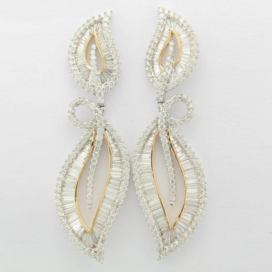 The earrings are beautifully crafted with round and baguette diamonds. The dainty and abundant diamonds exhibit a strong and distinct luster. The earrings feature leaf-shaped embellishments with delicate cutouts.