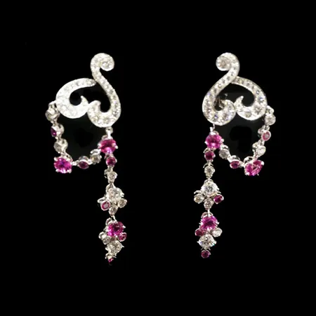 This pair of drop earrings shines brilliantly with its white diamonds and pink sapphires. The dangling gems can help you create the most spectacular look. These earrings will delight every jewelry collector.