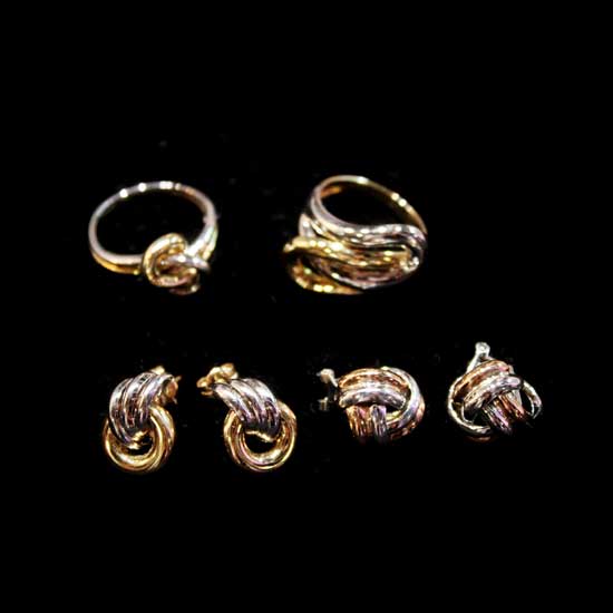 The exquisite pair of earrings and ring are finely constructed form yellow gold and white gold. The pieces of jewelry have lustrous surfaces and unique shapes.