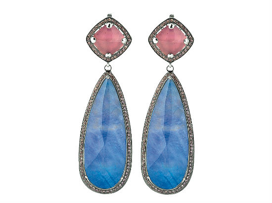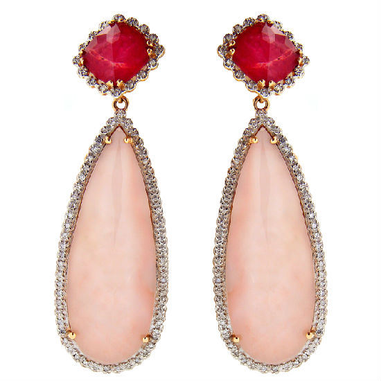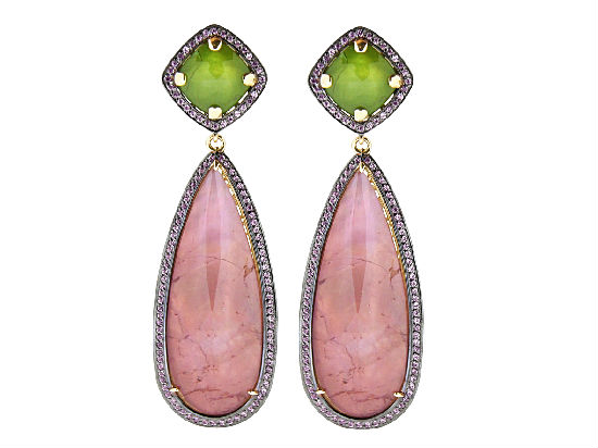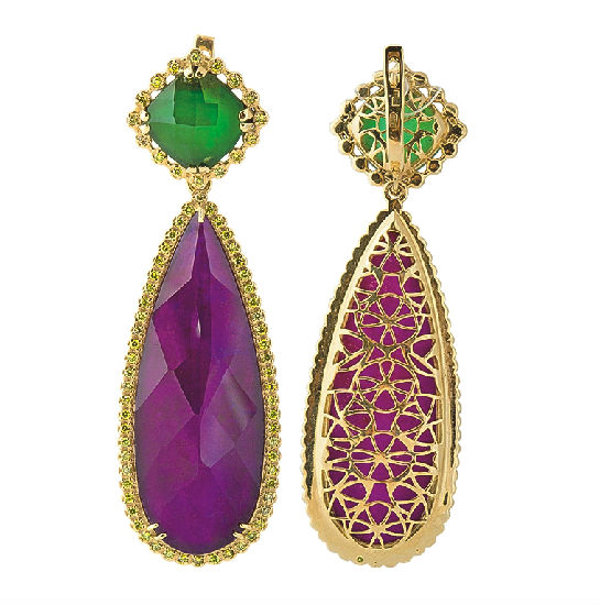 Gold earrings with green tourmaline-doublet and amethyst-doublet. Can be made of gold or palladium with lots variations of stones.