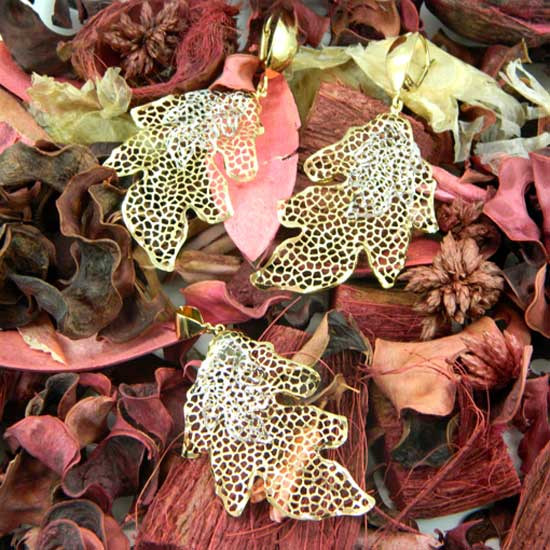 The gold earrings and pendant feature a double-toned design. The items are crafted in a leaf shape with allover cutouts on the surface. The earrings and pendant are perfect for creating a unique and consistent look.