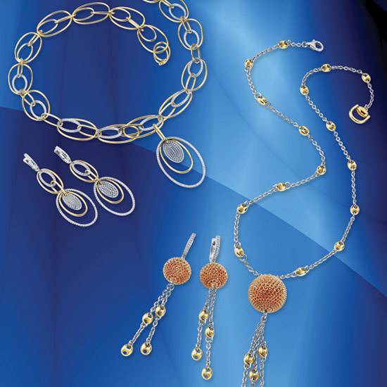 Here are two sets of jewellery that includes earrings and necklaces. Various patterns are available, including pendants featuring concentric circles. Some earrings featured with red coral-like balls, which have square link chains and golden decorations as the drops.